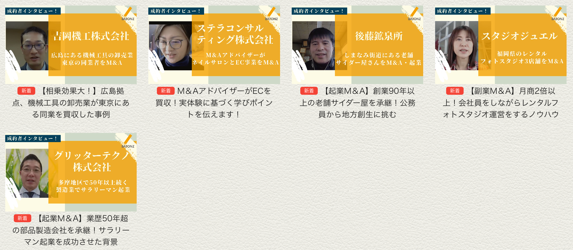 そこでバトンズは、これまでバトンズを活用してM&A成約した方々にご協力いただき、「M&A事例動画」を公開しました。目的・買収戦略の設定、フェアバリューでの買収、DD(企業調査)、PMI(買収後の経営計画)にフォーカスしたM&A成約までのストーリーと、譲り受け後の取り組みや現状までのお話を30分程度のインタビュー形式で視聴いただくことができます。