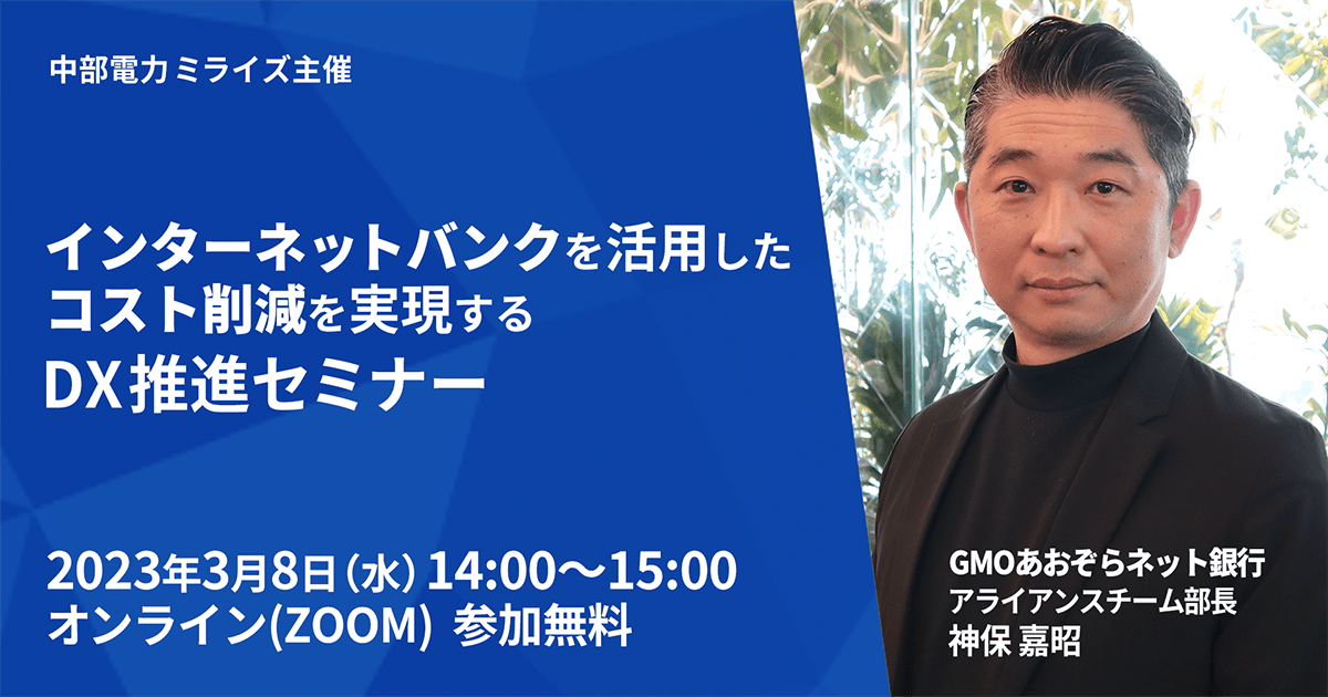 【3/8(水)オンラインセミナー】 中部電力ミライズ主催「インターネットバンクを活用したコスト削減を実現するDX推進セミナー」に登壇