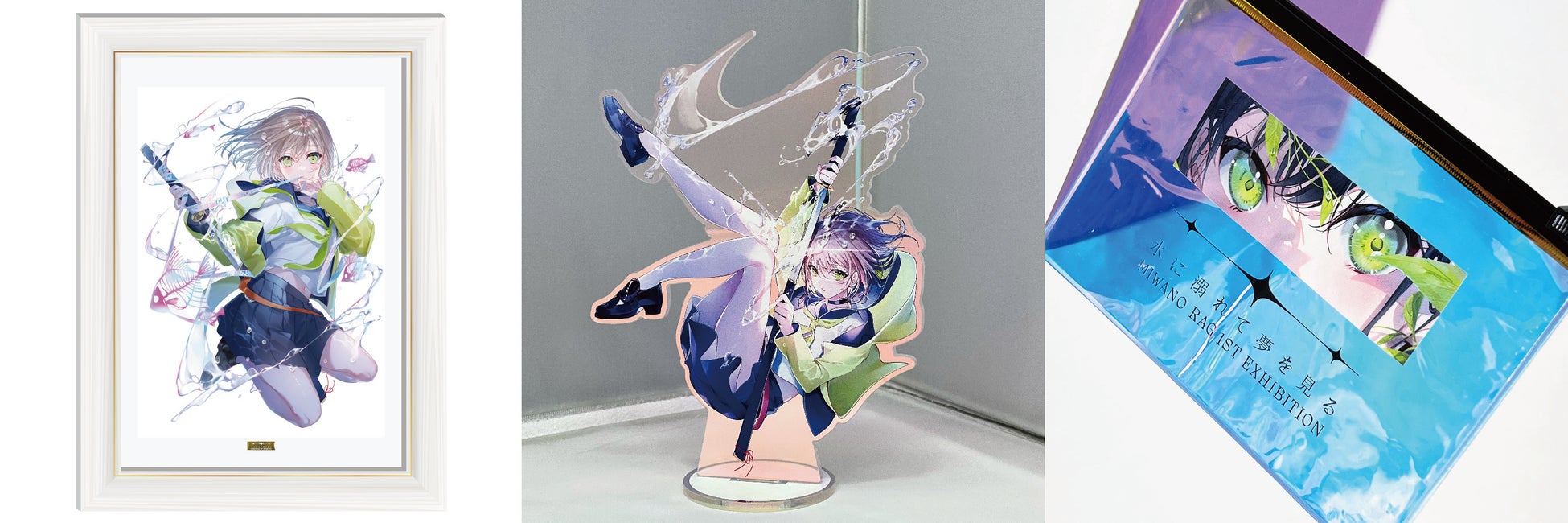 本展では、美和野らぐ氏のイラストの透明感を象徴する「水」をテーマに、透明感のある素材やオーロラカラーを用いたグッズを複数ラインナップ。また美和野らぐ氏自身が歴代の作品から選んだ、特に印象深いイラストで作成したアクリルアートや、本展のために新たに制作した作品集など、デジタルイラストの創作開始から10周年を記念するグッズを多数展開します。