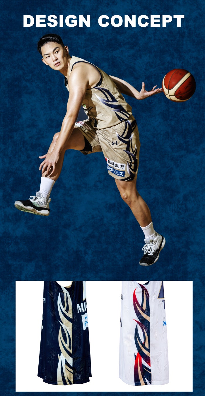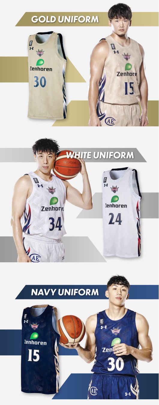 自分達の色=「力」を最大限に発揮するようにと意味を込めたゴールドメインのユニフォーム。サイドデザインには、ネイビーからホワイトへのグラデーションを取り入れ、様々な状況の中でも立ち止まらず、常に変化し突き進んでいくイメージが表現されています。