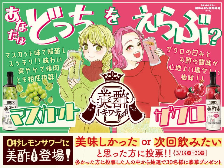 GOSSO株式会社(本社:東京都渋谷区、代表取締役:藤田建、以下 当社)は、「0秒レモンサワー® 仙台ホルモン焼肉酒場 ときわ亭」(一部店舗を除く)で、2023年3月14日(火)〜3月31日(金)の期間限定で、CJ FOODS JAPAN株式会社(本社:東京都港区、代表取締役:林暻逸)が展開する100%果実発酵のお酢「美酢(みちょ)」とのコラボキャンペーン『ミス(美酢) トキワテイ 2023』を開催します。期間中、「0秒レモンサワー」のフレーバーシロップとして「美酢ざくろ」と「美酢 マスカット」を導入し、人気投票を実施します。人気の高かったシロップに投票された方の内、抽選で30名様に「美酢」とときわ亭のコラボグッズをプレゼントいたします。https://zero-tokiwa.com/