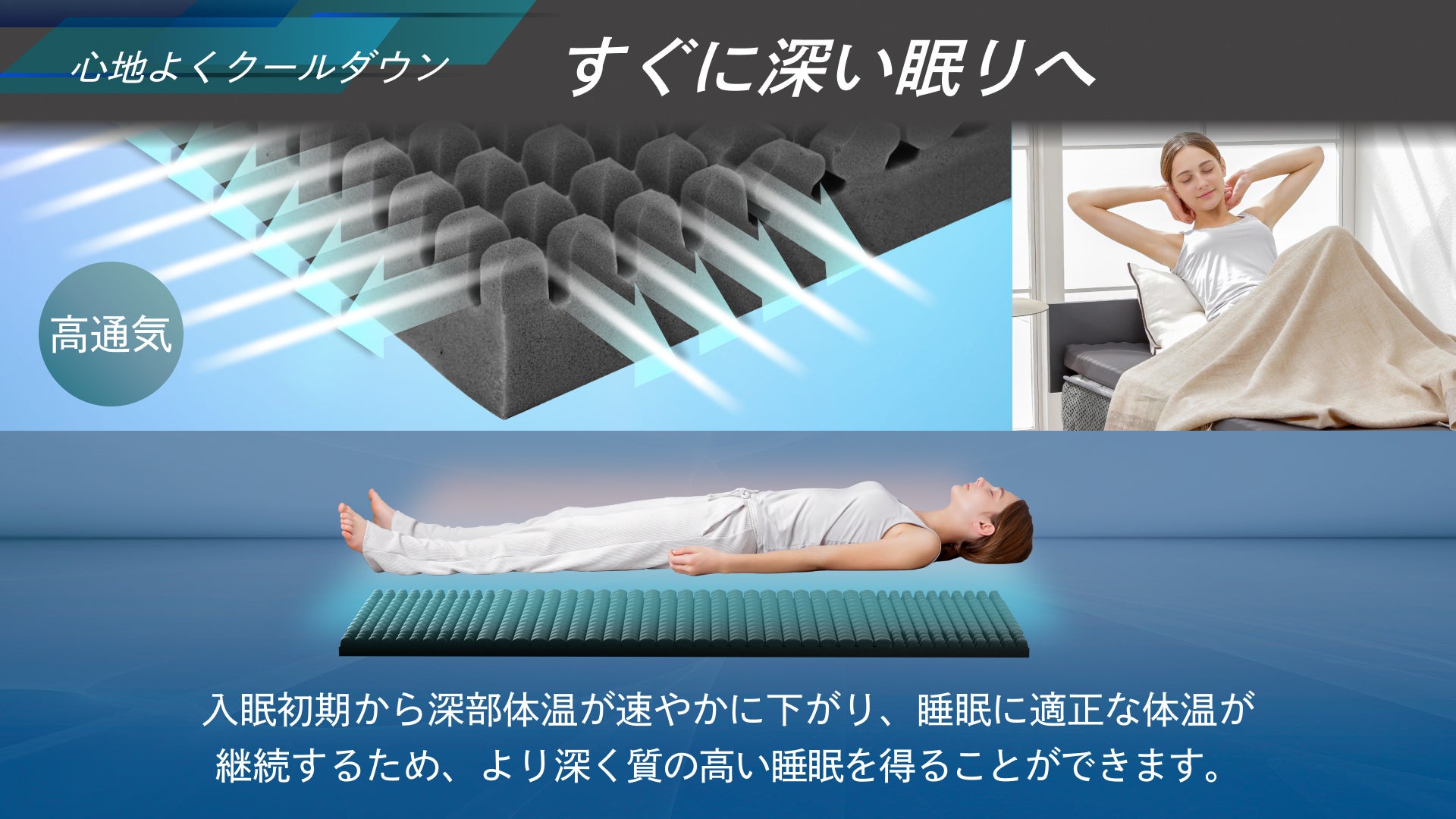 睡眠とパフォーマンスの関係性に着目し、徹底的に研究を重ねました。アスリートが試合で最高のパフォーマンスを発揮するため、また会社員が重要な会議で集中力を維持するために欠かせない「入眠スピード」と「体の部位ごとに異なる体圧分散」を実現する設計を採用しています。新シリーズ第1弾「AirZERO 3Dセルマットレス ポータブルタイプ」は、快適な眠りを叶えるために生まれた革新的なプロダクトです。