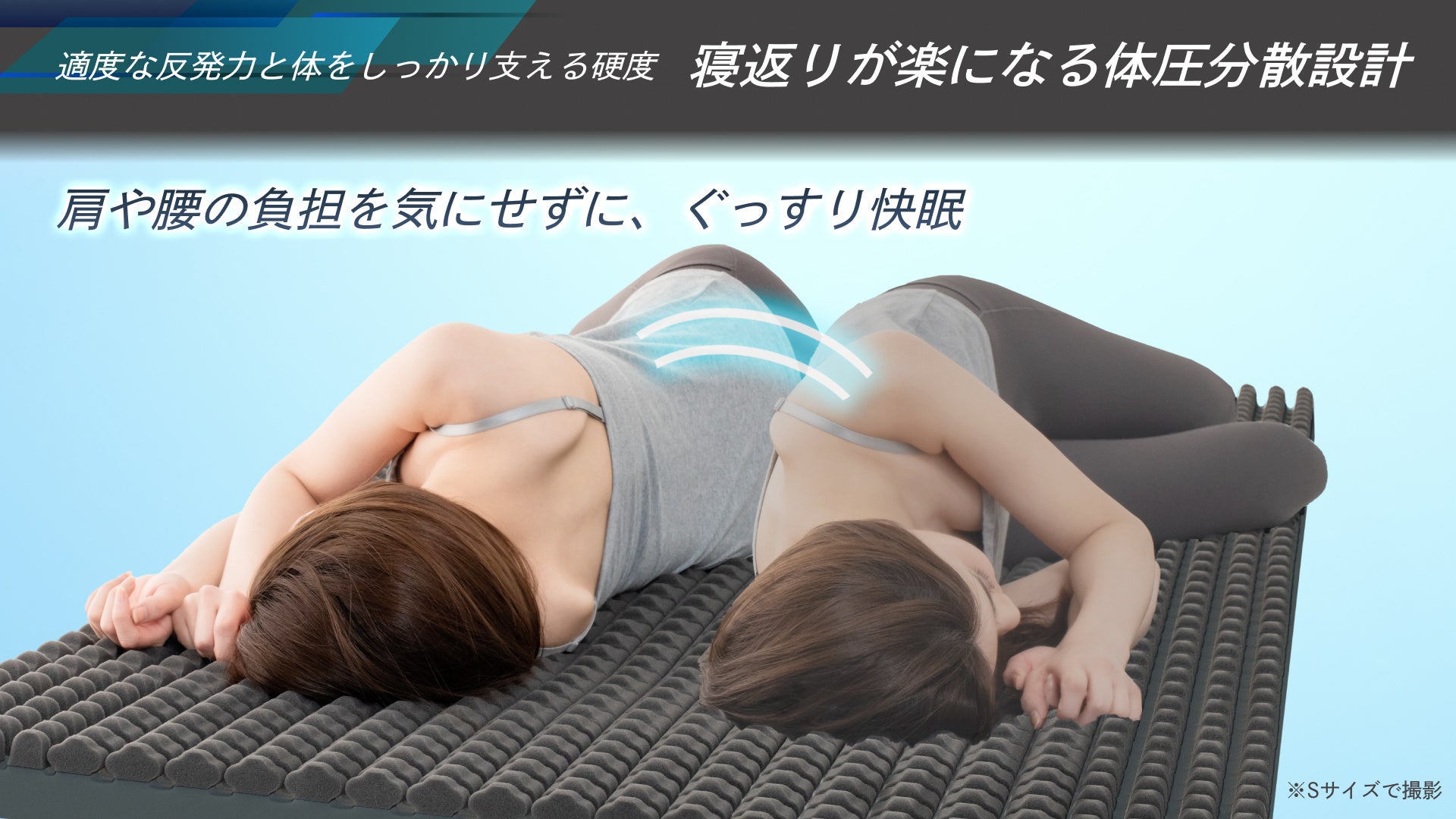 前後左右に動く独自の立体セルが、身体の曲線や負荷に合わせて微細な角度でフィットします。高反発のベース部分がしっかりと支え、寝返りをスムーズにする体圧分散設計です。