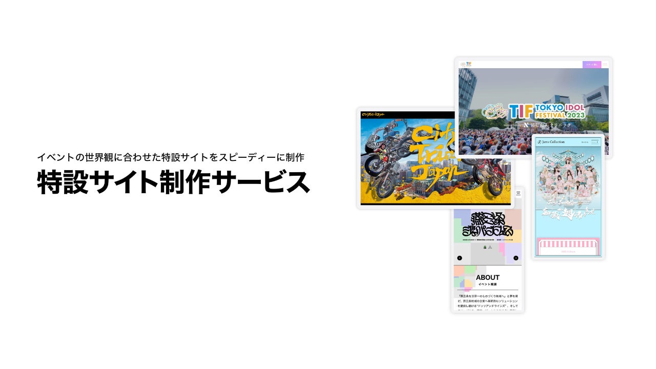 TIGETでは、イベント主催者様向けに、アーティストやイベントの特徴に合わせた特設サイトを多く制作しています。アイドルイベントやお笑い、スポーツ、祭りなど幅広いジャンルに対応可能です。ノーコードツール「STUDIO(スタジオ)」を活用し、低コストで高品質なサイトをTIGET専属デザイナーが制作します。