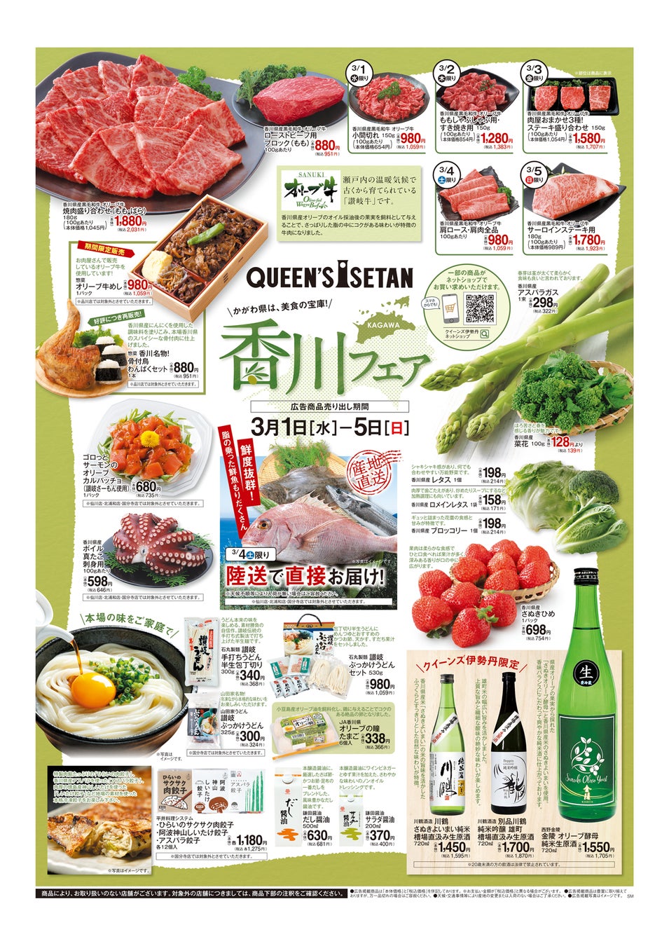 香川県オリジナル品種のいちご”さぬきひめ”をはじめ、3月4日(土)限定!香川県から産地直送で鮮度の良い魚を漁港よりクイーンズ伊勢丹にお届けいたします。さらに香川県産「オリーブ牛」がフェア開催期間中毎日お買い得に!香川県産オリーブのオイル採油後の果実を飼料として与え、瀬戸内の温暖な気候で育てられた「オリーブ牛」はさっぱりとした脂の中にコクのある味わいが特徴。ステーキ、すき焼きなど様々な料理でお楽しみいただけます。お惣菜コーナーではお肉屋さんで販売しているオリーブ牛を使用した「オリーブ牛めし」をご用意しております。