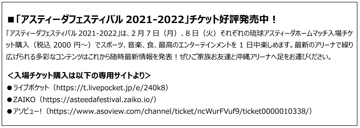 昨年12月の開催で2万人超の集客を実現した琉球アスティーダの祭典「アスティーダフェスティバル2021-2022」。withコロナ時代のコロナ復興イベントとして“サステナブルな沖縄経済”を目指すため、予定している2022年2月7日(月)、8日(火)の沖縄アリーナでの開催を決行することを宣言いたします。