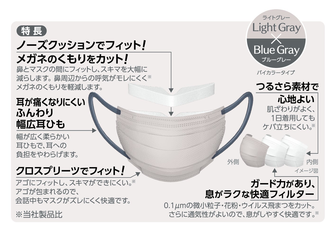 今回新発売する『快適ガードプロ ふつうサイズ グレースタイル5枚入』は、快適ガードプロの商品機能はそのままに、マスク本体がライトグレー、耳ひもがブルーグレーのバイカラータイプとなっています。