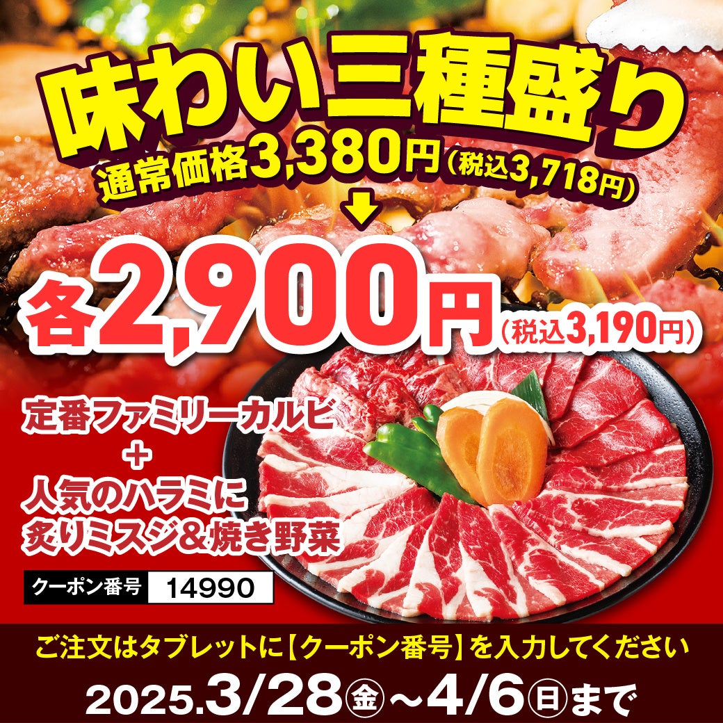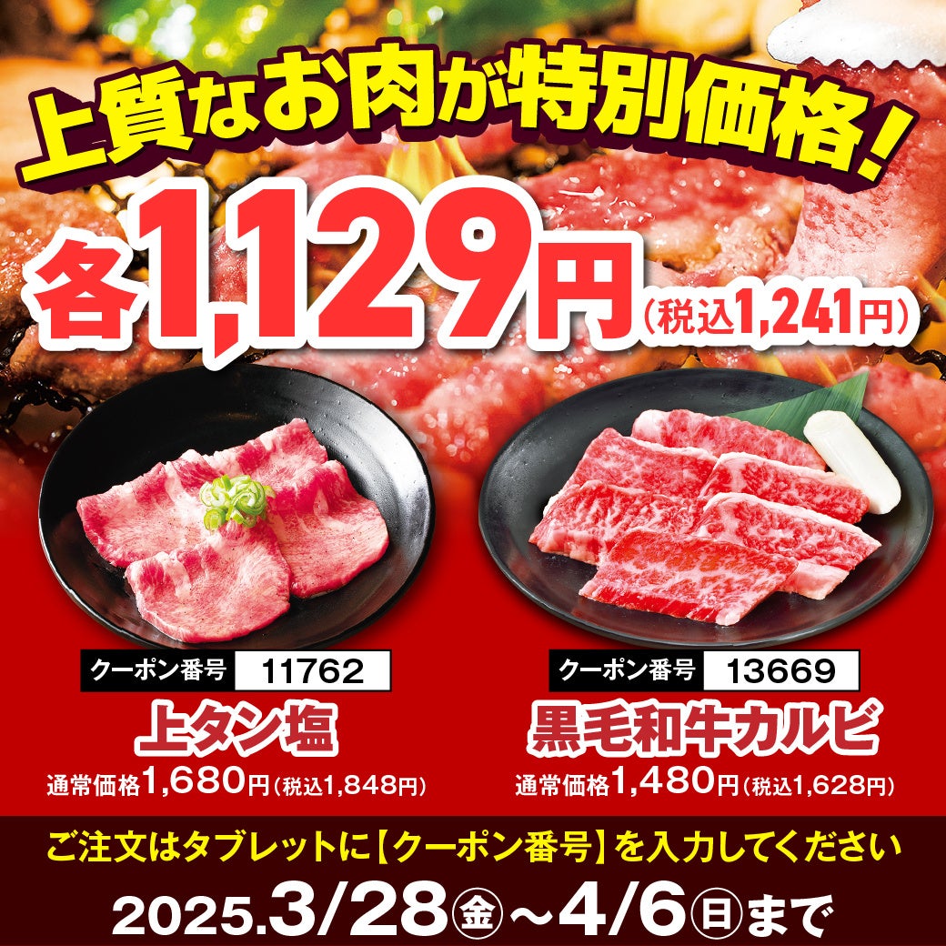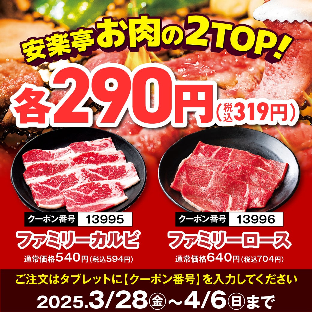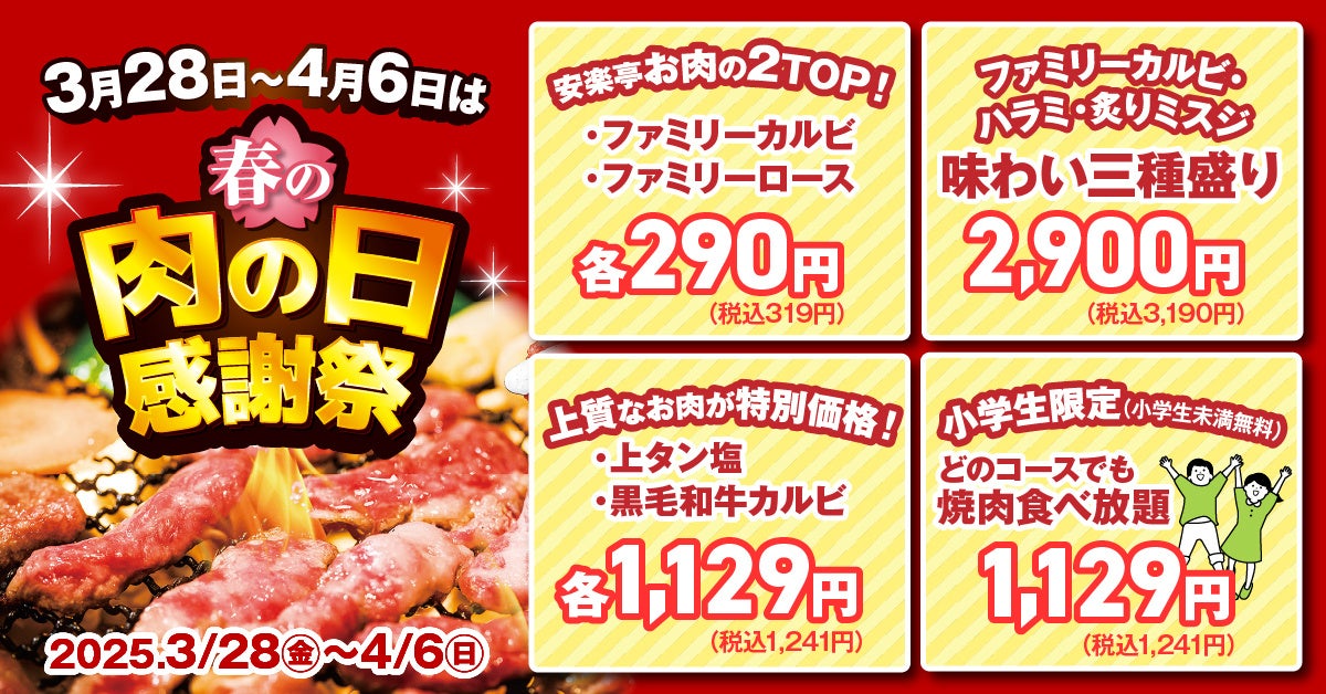 【安楽亭】今月は「春の肉の日感謝祭!」 3/28~4/6まで「ファミリーカルビ/ファミリーロースが290円(税込319円)など特別価格!「お肉が食べたい!」そんなあなたの肉の日に、安楽亭で焼肉三昧!