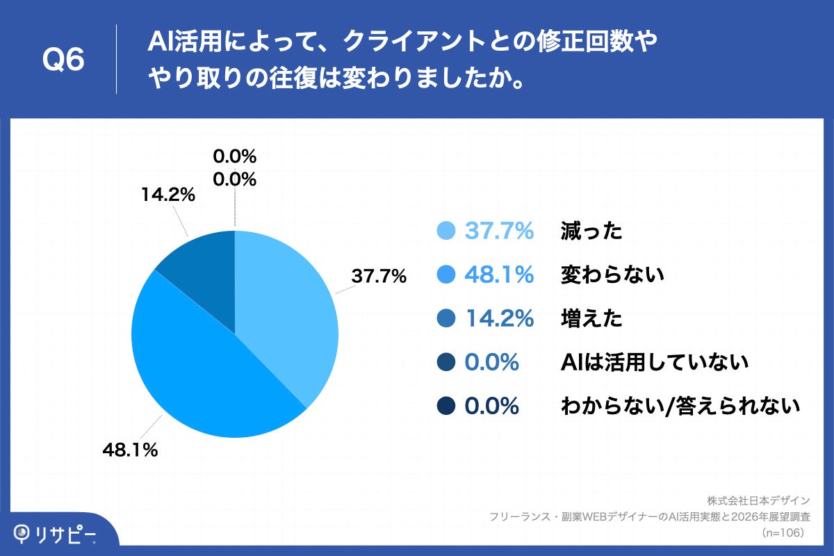「Q6. Q4で「AIは活用していない」以外を回答した方にお聞きします。AI活用によって、クライアントとの修正回数ややり取りの往復は変わりましたか。」(n=106)と質問したところ、「減った」が37.7%、「変わらない」が48.1%という回答となりました。