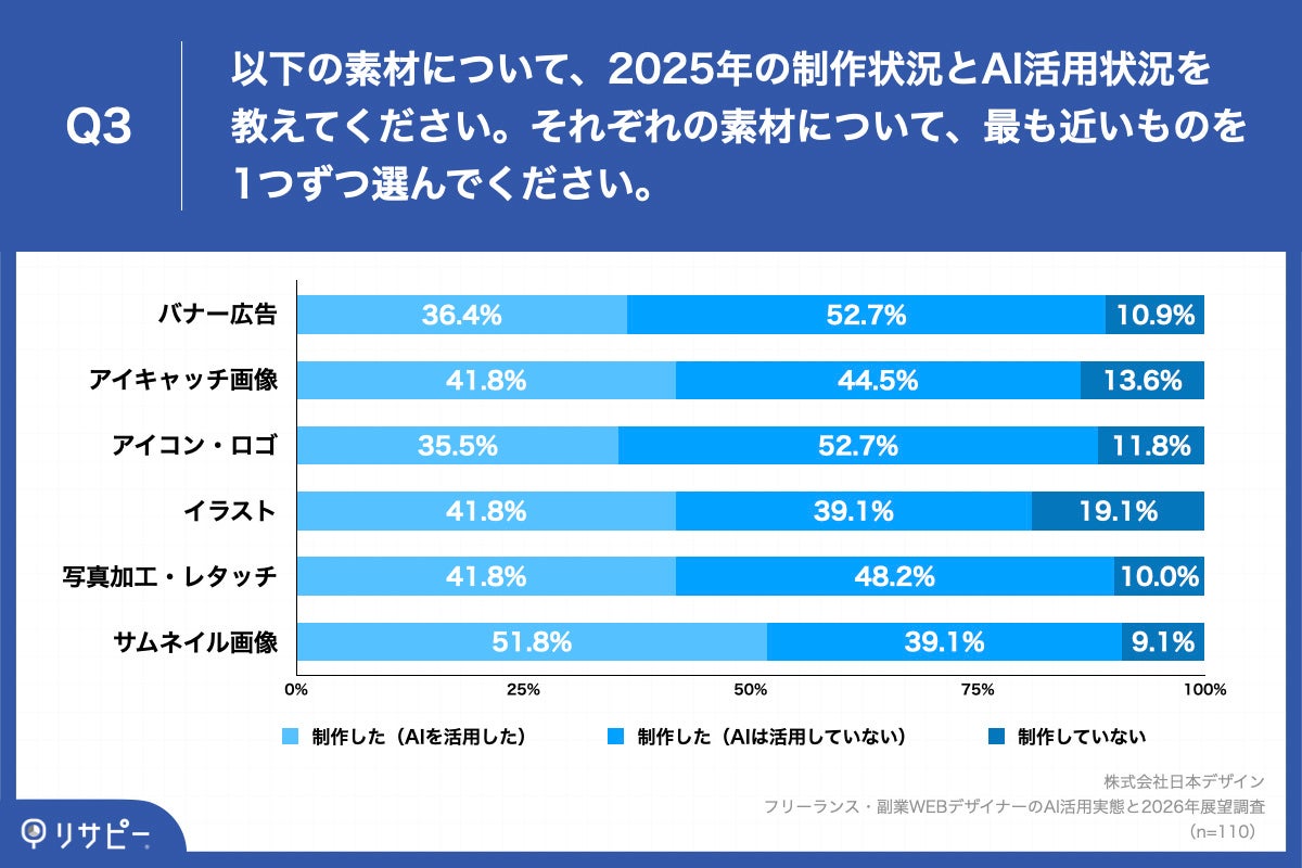 「Q3. 以下の素材について、2025年の制作状況とAI活用状況を教えてください。それぞれの素材について、最も近いものを1つずつ選んでください。」(n=110)と質問したところ、「バナー広告」は「制作した(AIを活用した)」が36.4%、「アイキャッチ画像」は「制作した(AIを活用した)」が41.8%、「アイコン・ロゴ」は「制作した(AIを活用した)」が35.5%、「イラスト」は「制作した(AIを活用した)」が41.8%、「写真・レタッチ」は「制作した(AIを活用した)」が41.8%、「サムネイル画像」は「制作した(AIを活用した)」が51.8%という回答となりました。