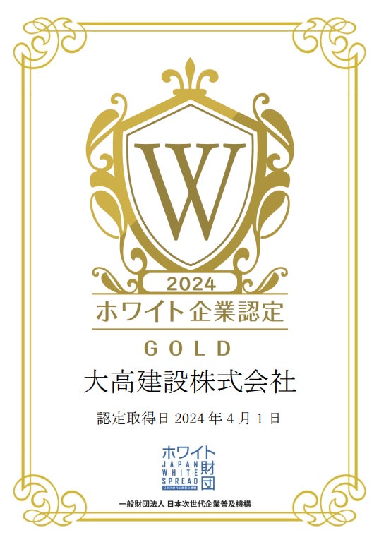 大高建設株式会社が、一般財団法人日本次世代企業普及機構(通称:ホワイト財団)が運営する「ホワイト企業認定 ゴールドランク」を取得したことをお知らせいたします。