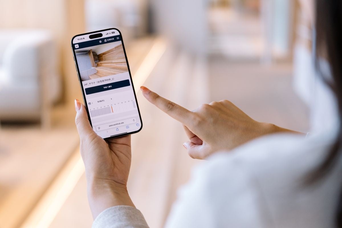 本ビルは、「Reboot!」においてサウナ、シミュレーションゴルフ、会議室など、ワーカーのwell-beingに寄与する充実した設備を備えています。「workhub」の専用サイトにスマホからアクセスすると、各施設の空き状況確認や予約ができるほか、利用時は、スマホで二次元コードをかざすのみで入室できます。予約受付から鍵の受け渡しまでワーカーのスマホで完結するため、管理スタッフとのやりとりなどを気にすることなく、ワーカーのペースでスムーズに利用できます。また、利用者による鍵の解錠は予約した時間のみ可能なため、セキュリティも安心です。