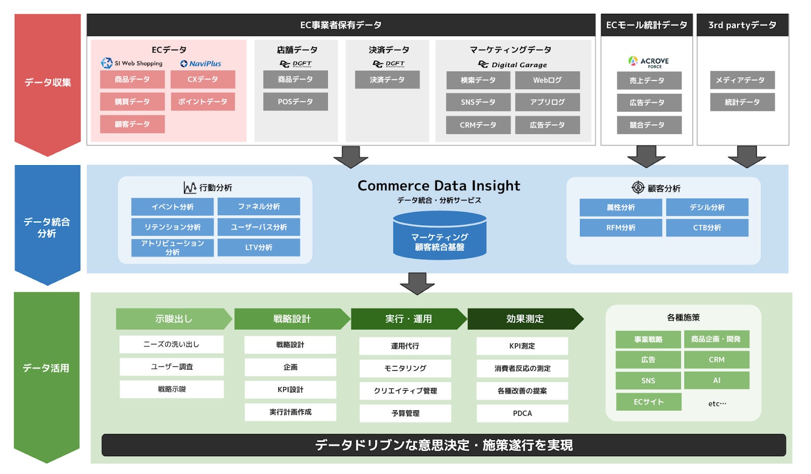 データとEC人材で事業社様と譲受ブランドの売上最大化を図る株式会社ACROVE(本社:東京都千代田区、代表取締役社長:荒井 俊亮、以下:ACROVE)は、EC事業者におけるデータドリブンマーケティング推進支援を目的に、株式会社デジタルガレージ(東証プライム 4819、本社:東京都渋谷区、代表取締役 兼 社長執行役員グループCEO:林 郁、以下:DG)のグループ会社で、デジタルコマースプラットフォームを提供する株式会社DGコマース(本社:東京都渋谷区、代表取締役社長:清水 和徳、以下:DGコマース)と業務提携し、データマネジメントプラットフォーム「Commerce Data Insight(コマースデータインサイト)」の提供を開始します。