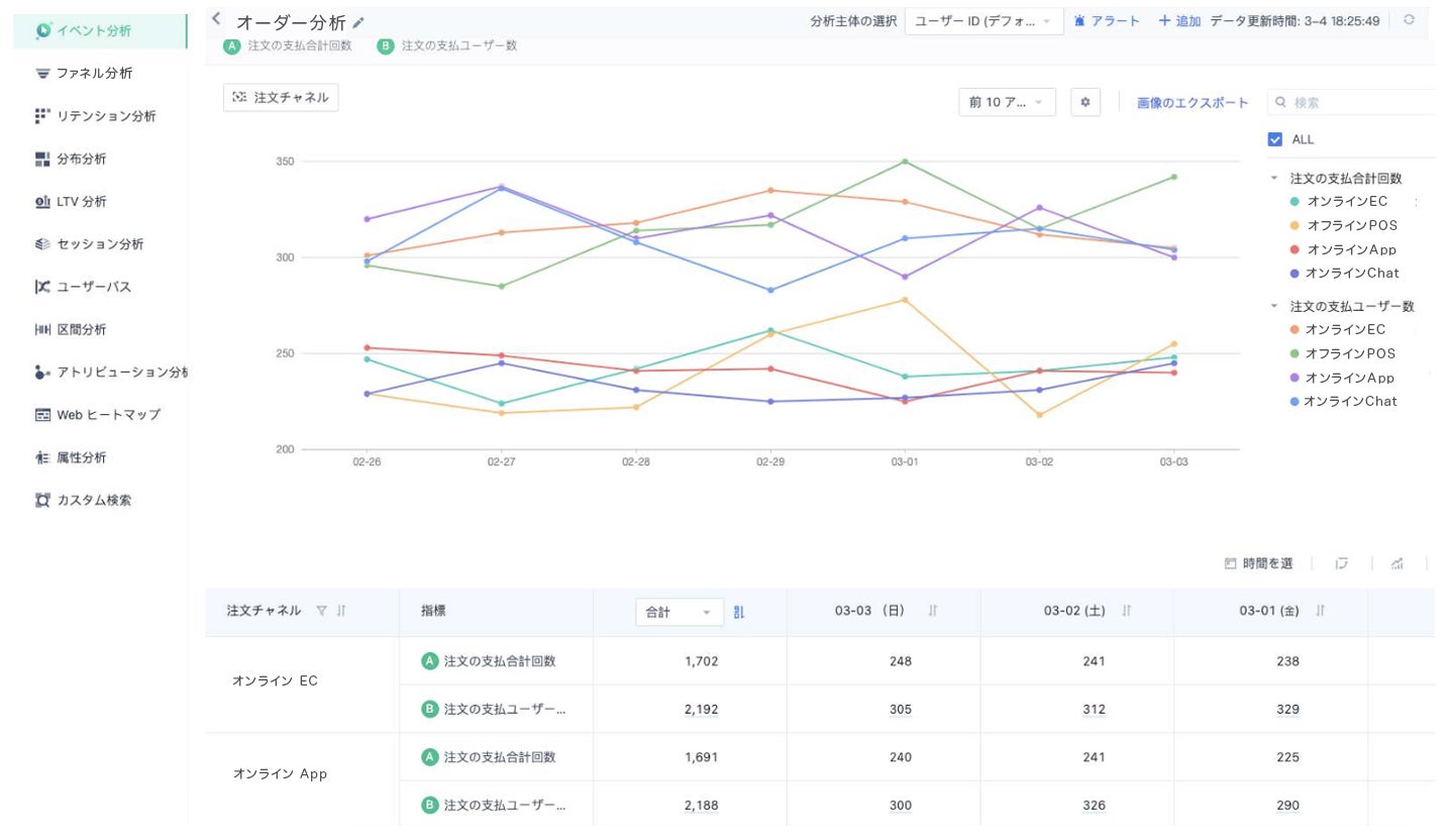 イベント分析、リテンション分析、アトリビューション分析、ファネル分析、ユーザーパス分析、LTV分析など、オンラインだけでなくオフラインのデータも活用しつつ、さまざまな側面からの行動解析が可能。