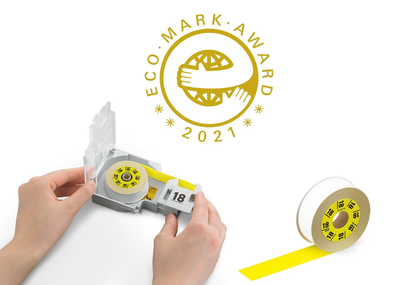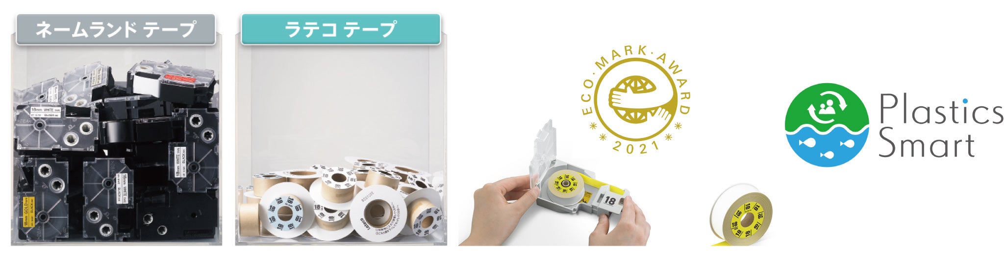 使用するテープは、カートリッジ自体は繰り返し使用し、内部のみを交換する詰め替え方式を採用。廃棄するのは紙製の芯のみで、従来機種に比べプラスチックごみを約97%削減しています。また、原材料のCO2排出量を60%以上削減※3。環境省が主催する「プラスチック・スマート」に参加しているほか、テープはエコマークに認定されており、エコマークアワード2021のベストプロダクトを受賞しました。
