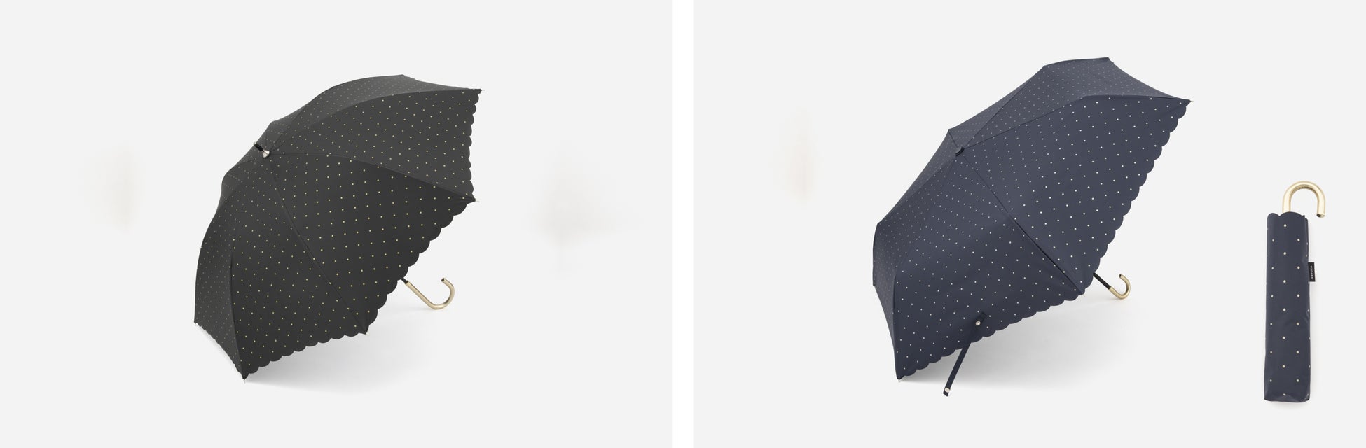 遮熱効果もあり、暑い日の熱中症対策にもおすすめです。防水加工を施しているため、雨の日でもご使用いただけます。新登場のプチドットグリッターは、キラッと光るグリッターのドットが女性らしく上品な一本に仕上げました。また、遮光レースカットシャンブレーは、昨年販売後即売り切れとなった大人気商品。シャンブレー調の涼し気なプリントで、裾には大きめのレース調のヒートカットを施しています。