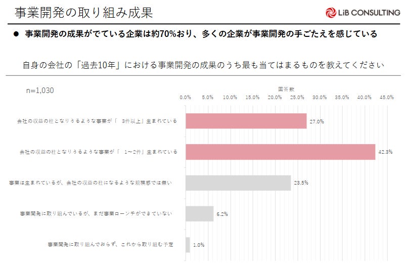 自身の会社の過去10年における事業開発の成果は「会社の収益になるような事業が1~2件以上生まれている(42.3%)」「会社の収益になるような事業が3件以上生まれている(27.0%)」と69.3%と多くの企業が手ごたえを感じている。