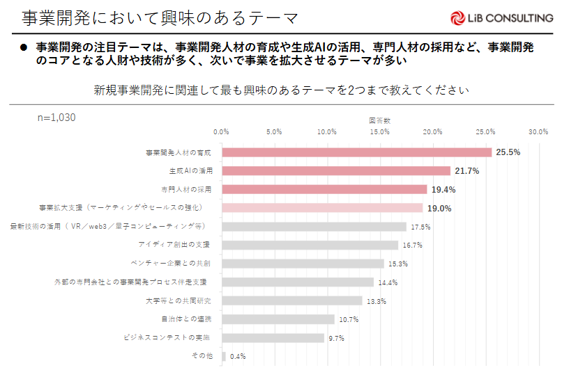 事業開発の注目テーマは、「事業開発人材の育成(25.5%)」「生成AIの活用(21.7%)」「専門人材の採用(19.4%)」と事業開発のコアとなる人材や技術についてが多く、次いで「事業拡大支援(マーケティングやセールスの強化)(19.0%)」が多い。