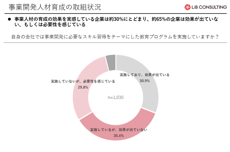 自身の会社で事業開発に必要なスキル取得をテーマとした教育プログラムを「実施しており、効果が出ている(30.9%)」にとどまり、「実施しているが、効果が出ていない(35.4%)」「実施していないが、必要性を感じている(29.8%)」と65.2%の企業が効果が出ていない、もしくは必要性があると感じている。