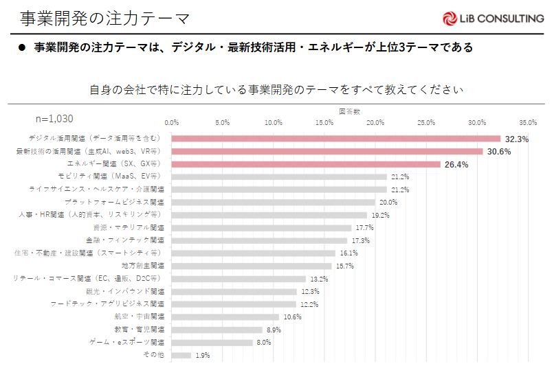 事業開発の注力テーマは「デジタル活用関連(デジタル活用等)(32.3%)」が最も多く、次いで「最新技術の活用関連(生成AI、web3、VR等)(30.6%)」「エネルギー関連(SX、GX等)(26.4%)」の順に多い。