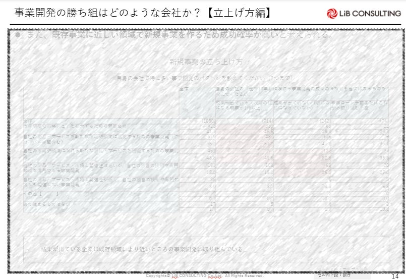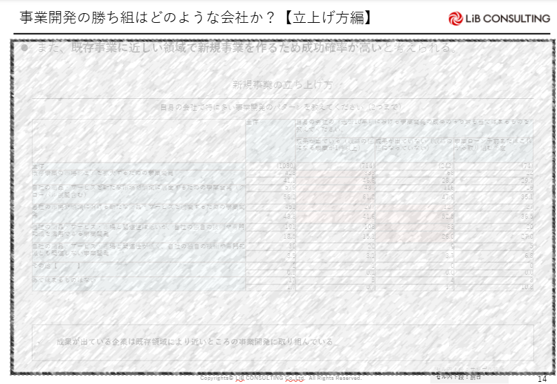 ・事業の立ち上げ方の多くは、既存事業と関連する内容となり、「新市場×新サービス」の事業開発は少ない