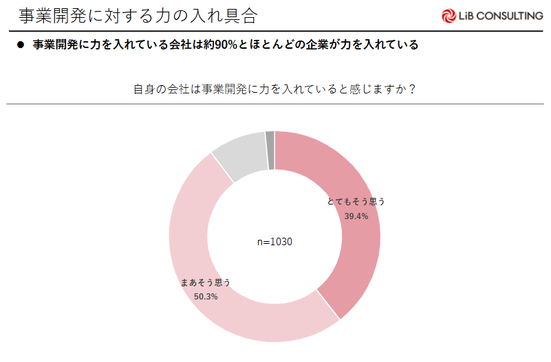 ・回答者のうち、「自社が事業開発に力を入れている」という回答は90%を超える