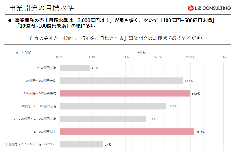 事業開発の売り上げ目標は「3000億円以上(20.6%)」が最も多く、次いで「100億円~500億円未満(19.9%)」「10億~100億円未満(18.8%)」の順に多い。