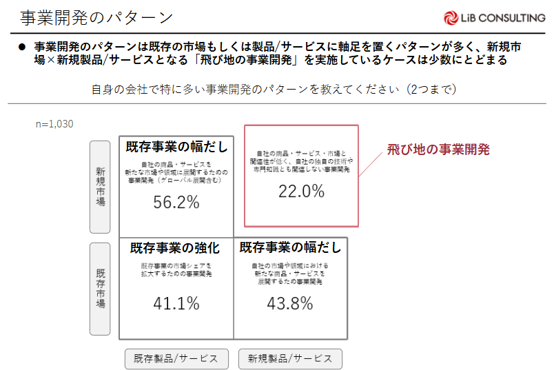 事業開発のパターンは「自社の商品・サービスを新たな市場や領域に展開するための事業開発(56.2%)」、「自社の市場や領域における新たな商品・サービスを展開するための事業開発(43.8%)」と既存の市場もしくは製品/サービスを軸足に置くパターンが多く、新規市場×新規製品/サービスとなる飛び地の事業開発「自社商品・サービス・市場と関連性が低く、自社の独自の技術や専門知識とも関連しない事業開発(22.0%)」を実施しているケースは少数にとどまる。
