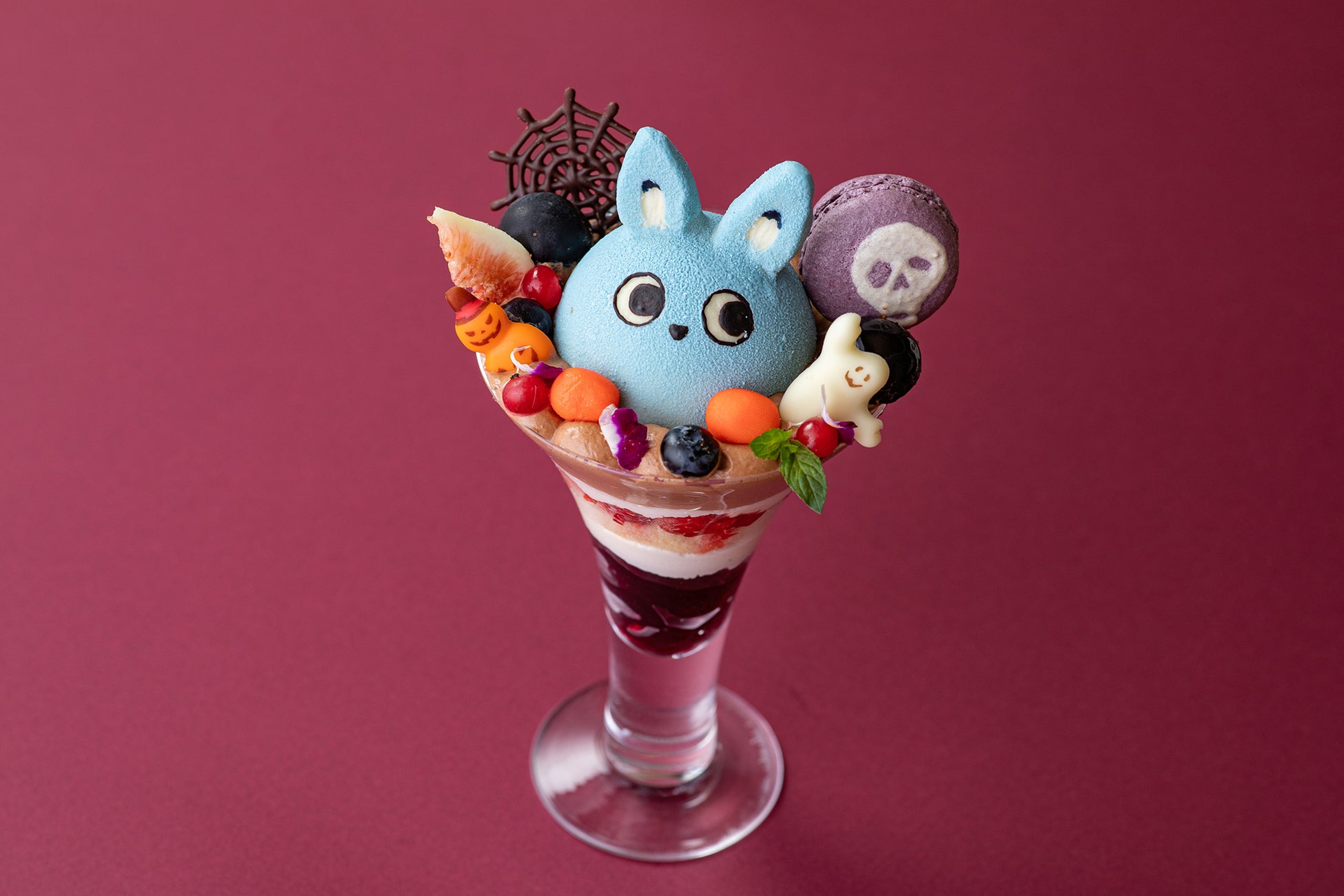 ハロウィンおばけと楽しむ「もころん」をイメージ。ブドウのゼリーやベリーソース、チョコレートクリームなどを重ね、ハロウィンおばけたちをにぎやかに飾りました。