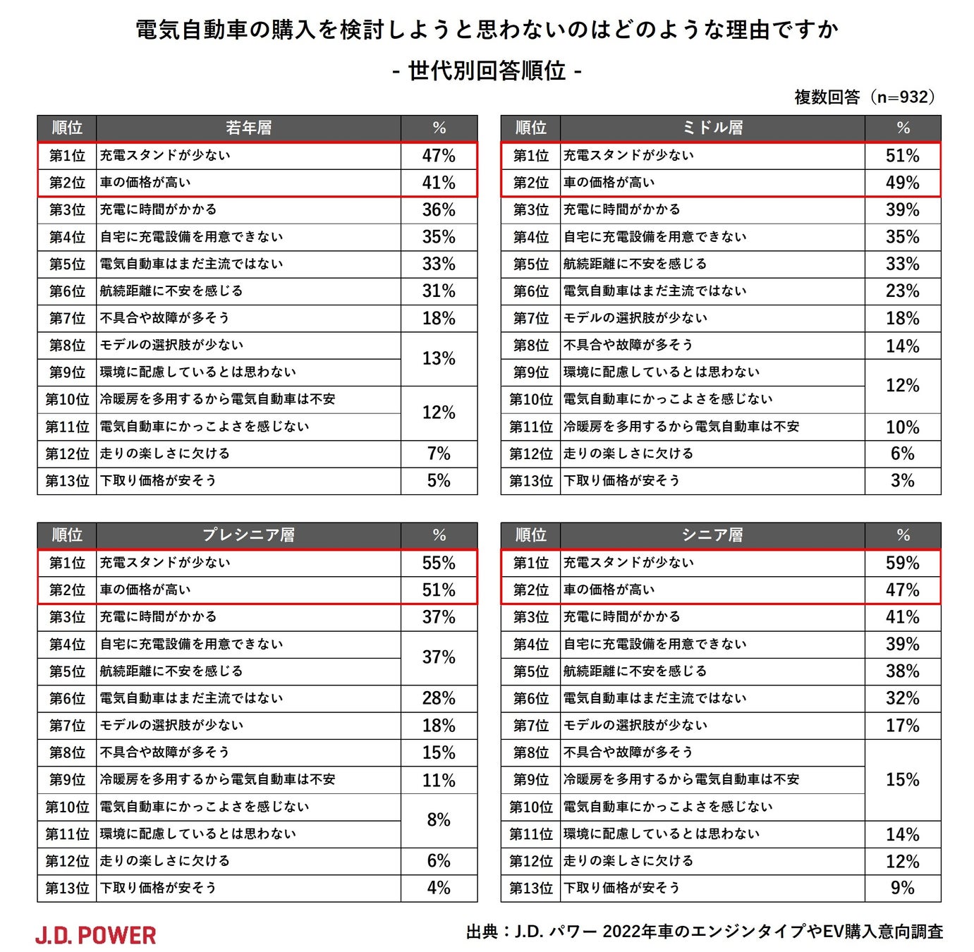 EVを検討しない理由として最も多くあがったのは「充電スタンドが少ない」で全世代で共通するものの、世代別に見ると、世代が上になるほど多くあげられる傾向が確認されました。若年層の47%に対して、シニア層は59%と+12ポイント高くなっています。次に多くあがった「車の価格が高い」については、プレシニア層で51%と最も多く、若年層の41%に対して+10ポイント高くなっています。