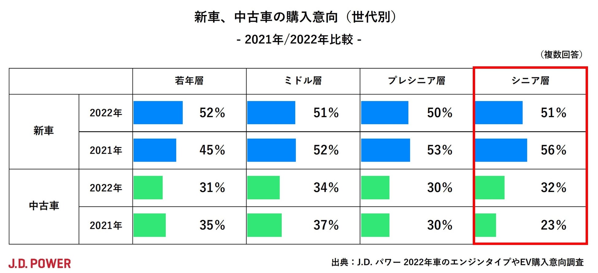 シニア層で新車の購入を検討する割合は、2021年の56%から51%に減少し、反対に中古車は2021年の23%から32%に増加しています。