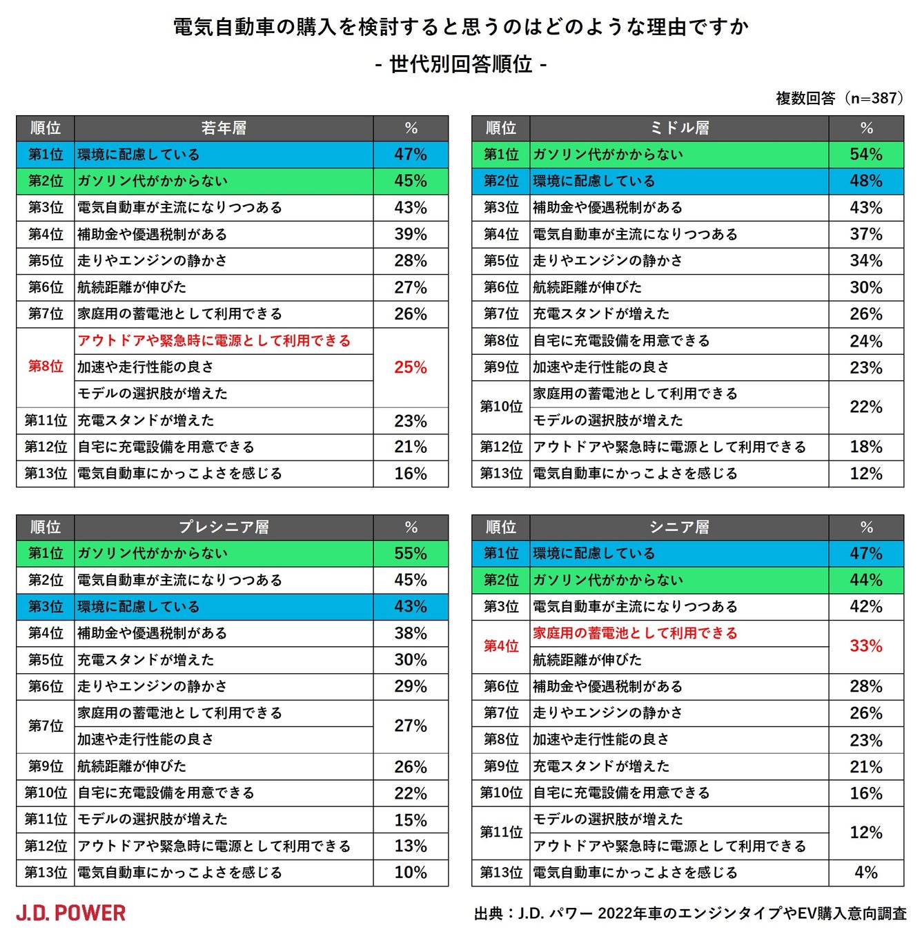 加えて、興味深いポイントとして、若年層では「アウトドアや緊急時に電源として利用できる」が他の年代より高く、車中泊旅やアウトドアといったトレンドの影響が感じられる結果となっています。