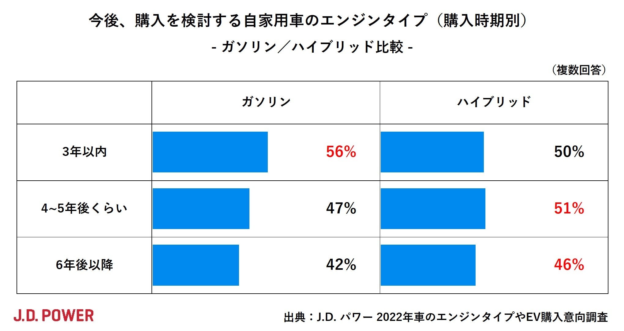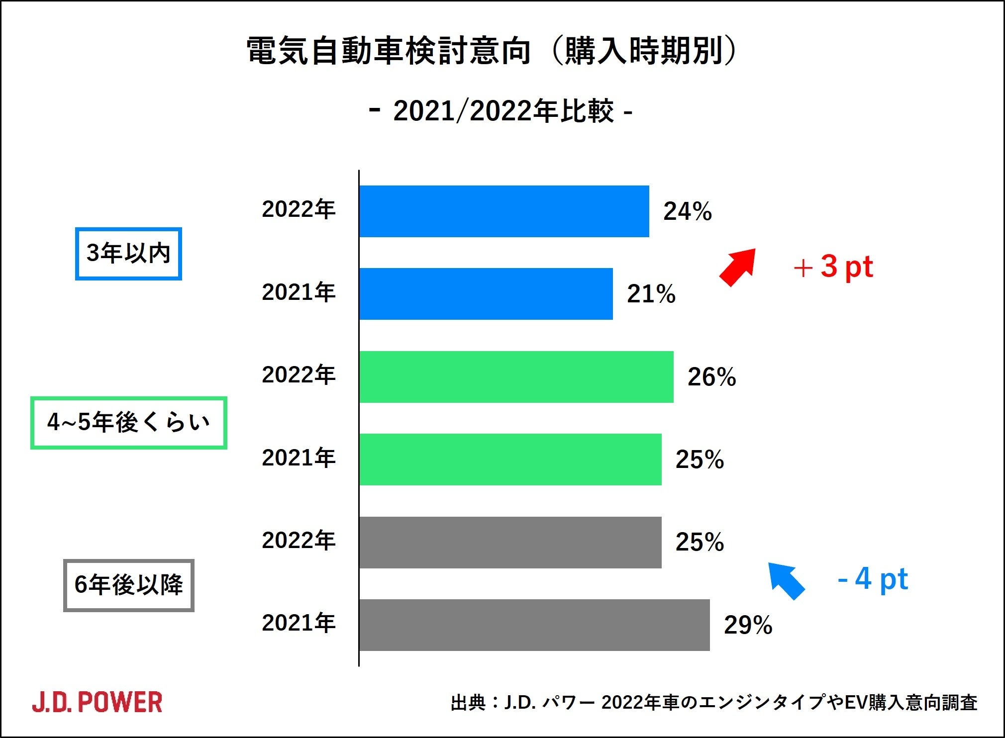 EVに着目すると、3年以内のケースでは24%で、2021年と比較すると+3ポイントとなっています。6年後以降のケースもほぼ同水準の25%でしたが、2021年と比較すると-4ポイントとなっています。