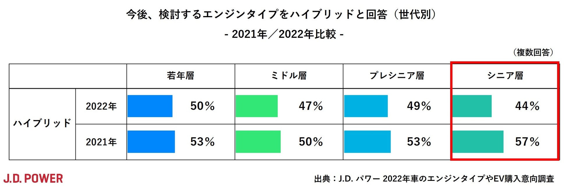 次に世代別に見てみましょう。ハイブリッド車の購入検討意向は2021年と比較すると、どの世代でも減っており、特にシニア層で、57%から44%と-13ポイントも減少していることがわかります。