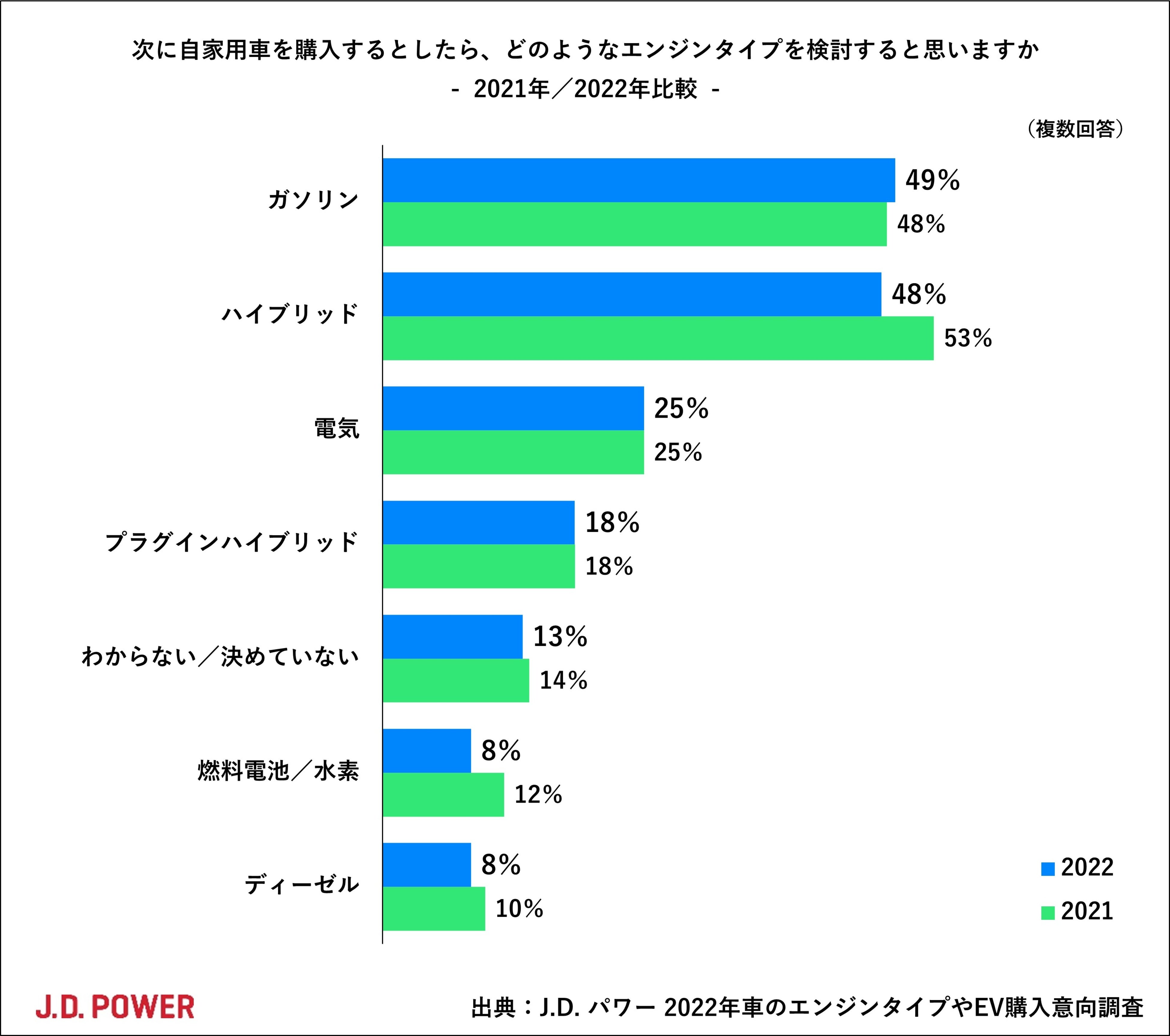 2021年調査と比較すると、トップだったハイブリッド車の検討意向が低下して、今回はガソリン車がトップとなりました。