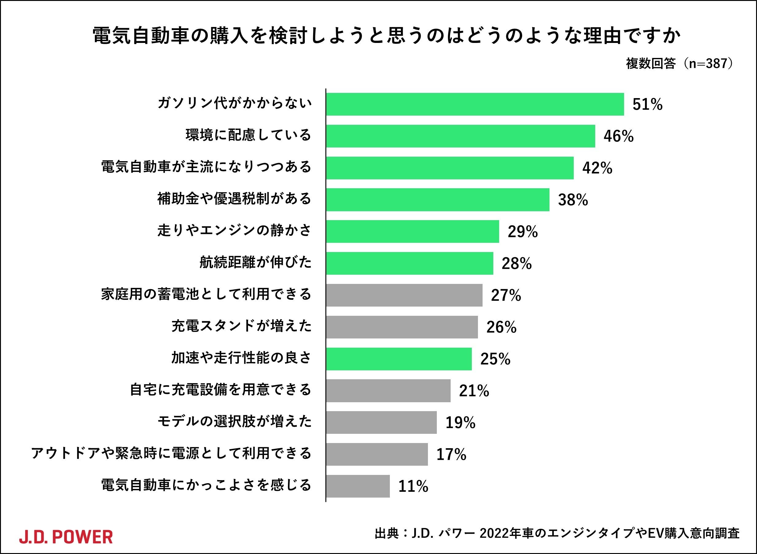 EV購入検討の理由トップ2は、「ガソリン代がかからない」(51%)、「環境に配慮している」(46%)