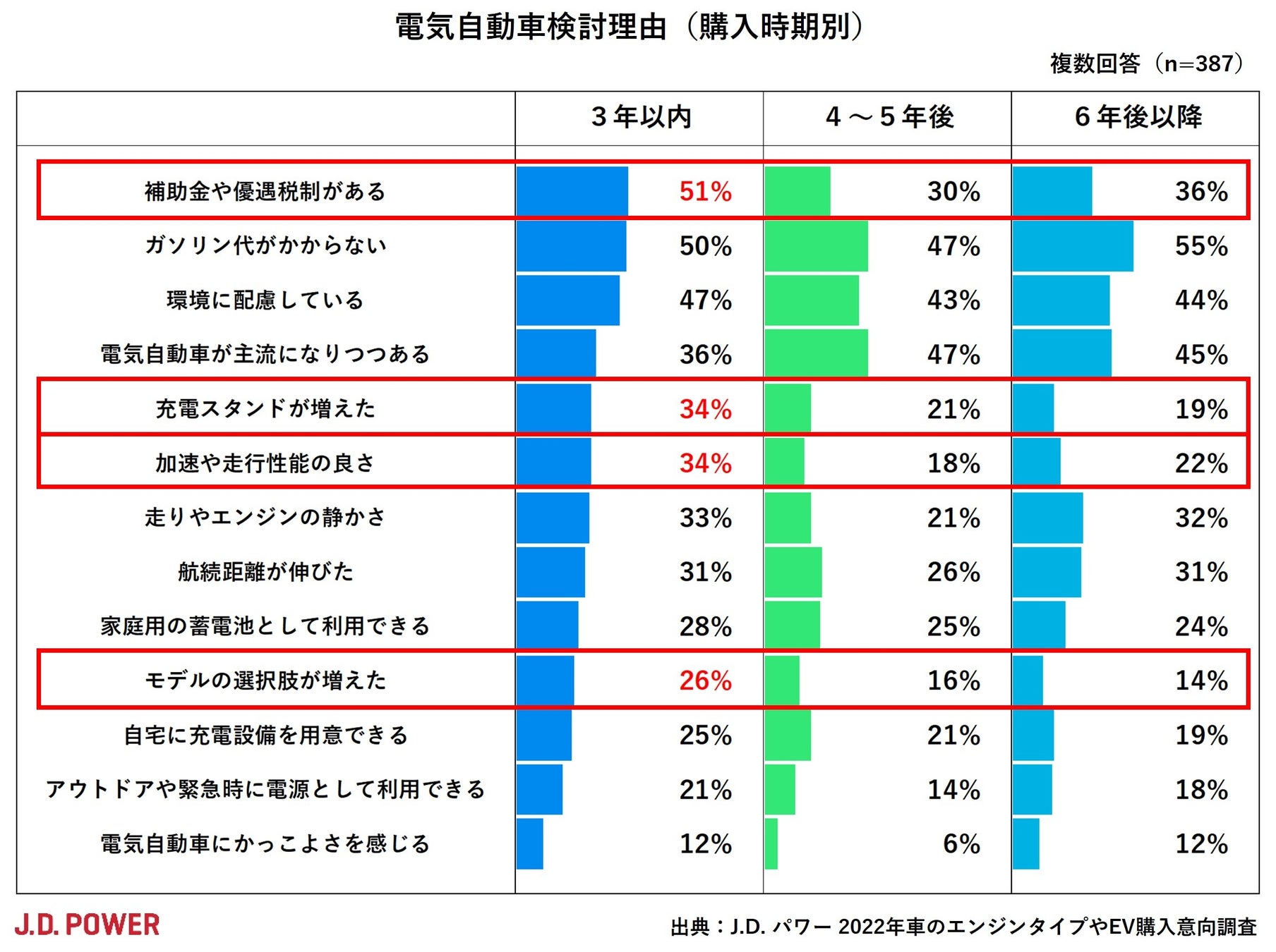 「充電スタンドが増えた(34%)」、「加速や走行性能の良さ(34%)」、「モデルの選択肢が増えた(26%)」も、4~5年後や6年後以降と比べると、それぞれ+10ポイント以上上回っており、EVを取り巻く環境に理解を示し、EVの性能が向上しつつあることを認める傾向がより強く出ているようです。