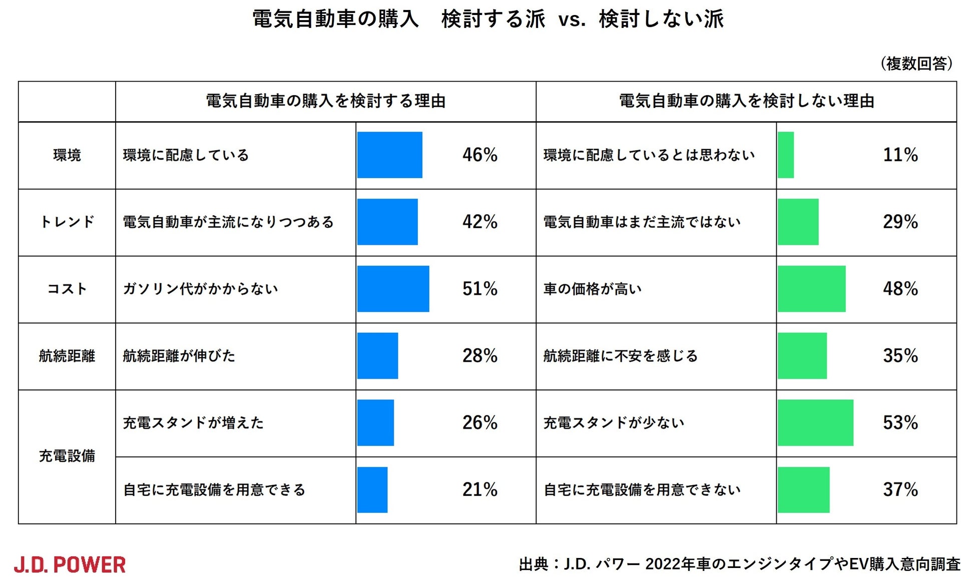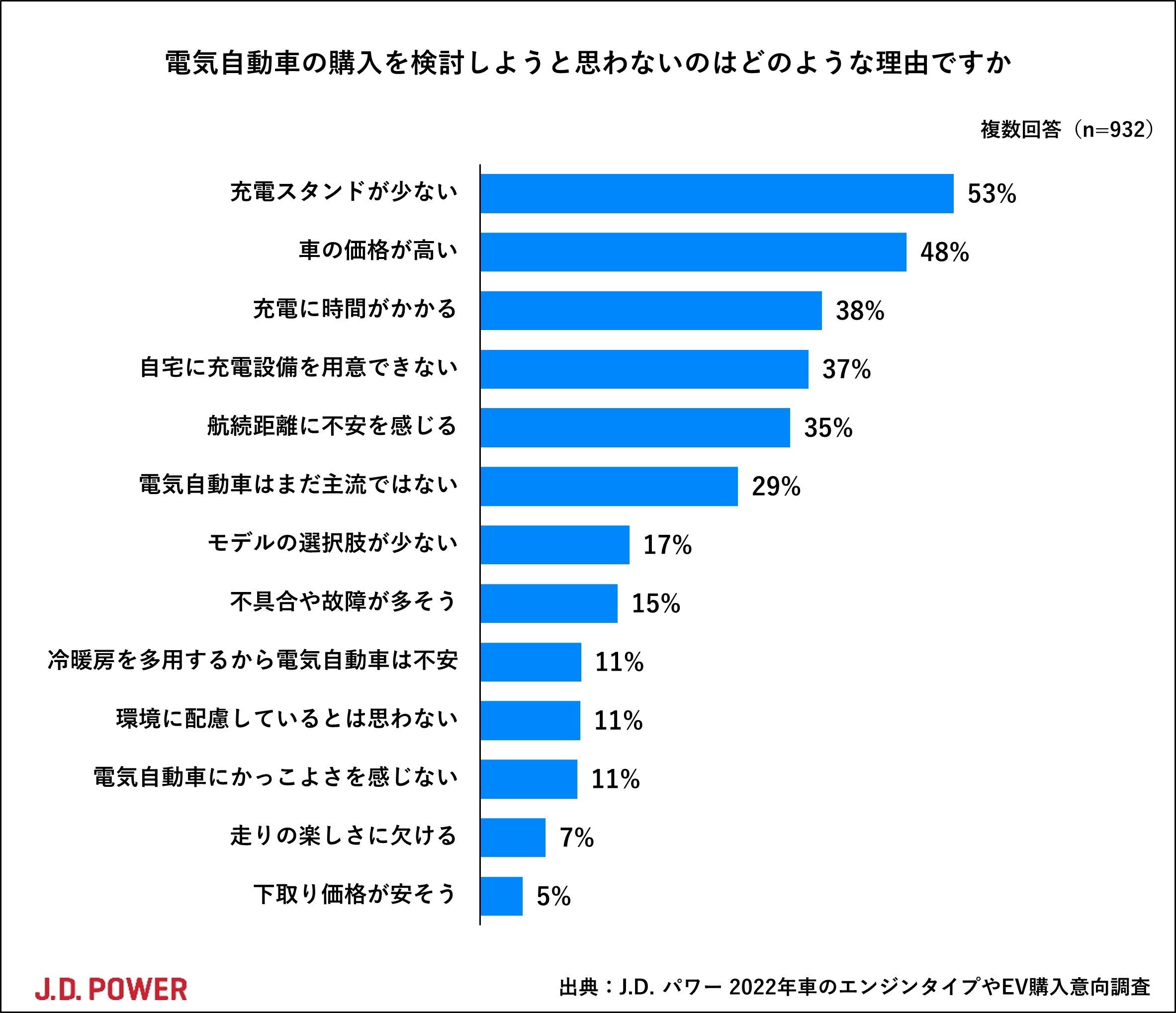 EV購入を検討しない理由トップ2は、「充電スタンドが少ない」(53%)、「車の価格が高い」(48%)