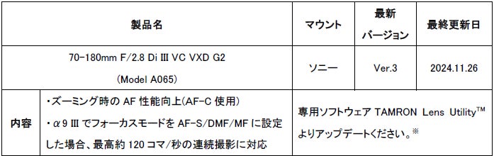 総合光学機器メーカーの株式会社タムロン(代表取締役社長:桜庭省吾、本社:さいたま市)は、タムロン「70-180mm F/2.8 Di III VC VXD G2 (Model A065)」ソニー Eマウント用のレンズファームウェアがアップデートしますことをご案内申し上げます。