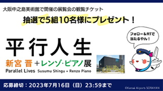 関西エアポート株式会社は、関西国際空港にゆかりのある新宮晋さんとレンゾ・ピアノさんの展示会 「Parallel Lives 平行人生 ― 新宮 晋+レンゾ・ピアノ展」の開催を記念したTwitterフォローキャンペーンの実施をお知らせいたします。