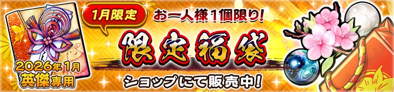 当月に開催されるガチャ「【槍刃此処より翔ける】&【イベント遺跡】特効!英傑 縁結び」で使用できる「【御朱印付き】1月・英傑結糸(10回)」を1個と、キャラクターの強化に必要なアイテムがまとめて手に入るお得なセットです。