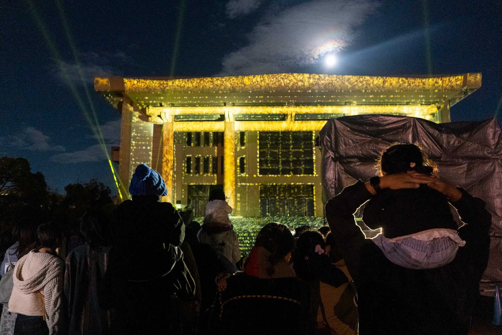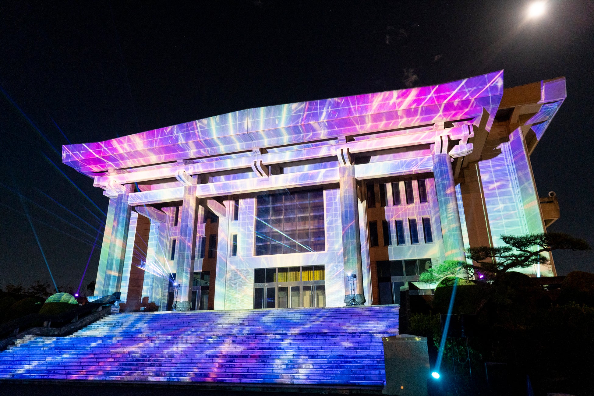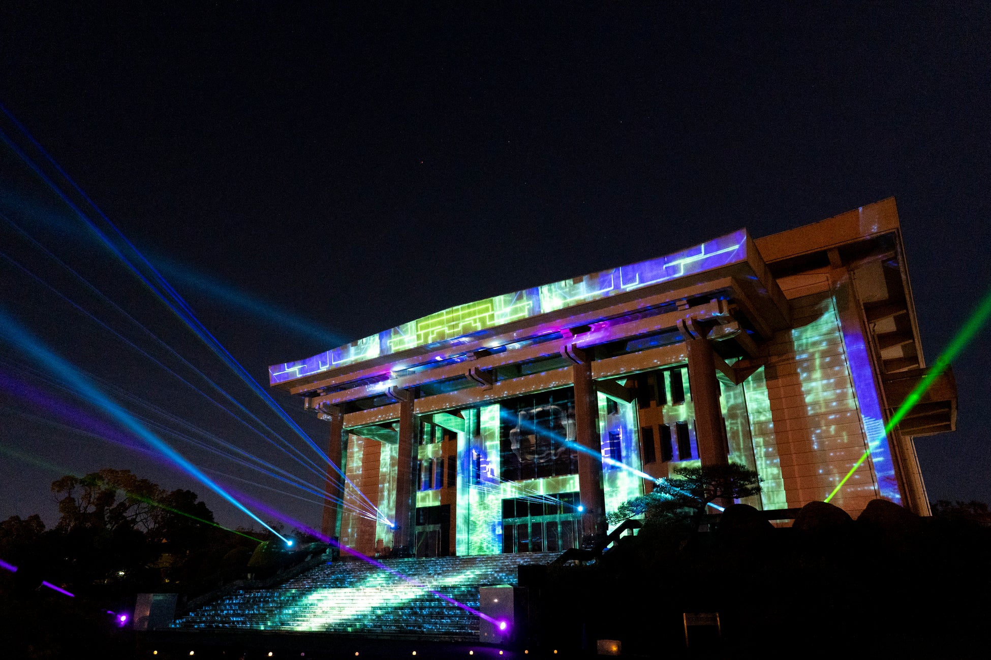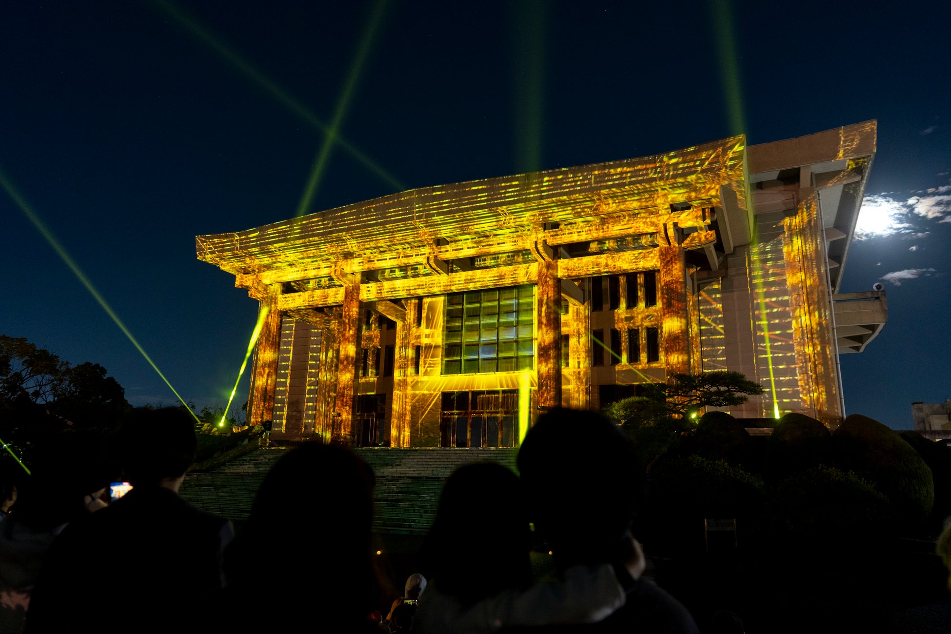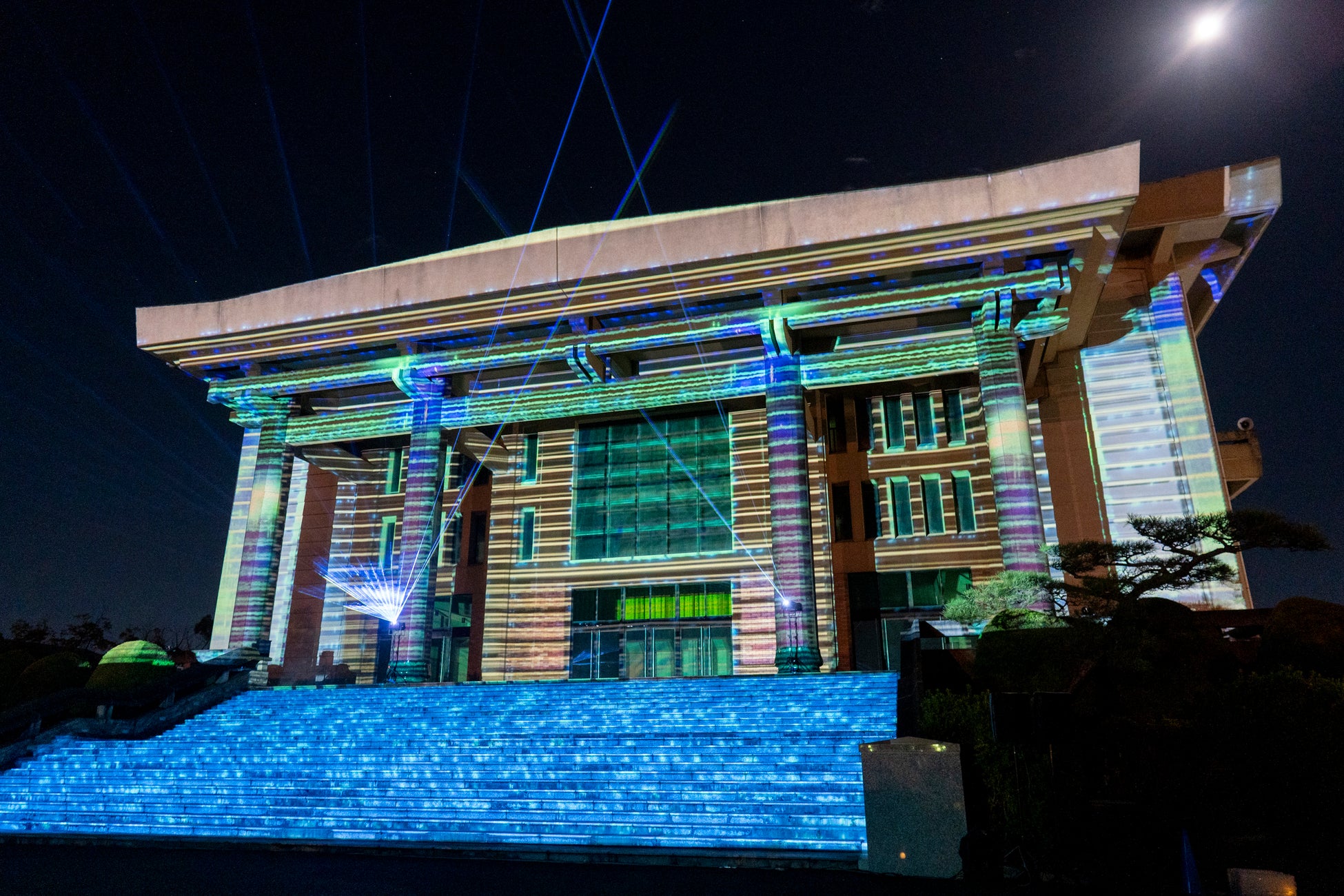 愛知学院大学のシンボルで幅約38メートル、高さ約25メートルの100周年記念講堂の建物に、日進市が誇る文化歴史をモチーフとしたデジタルアートコンテンツなどのプロジェクションマッピング映像を投影。