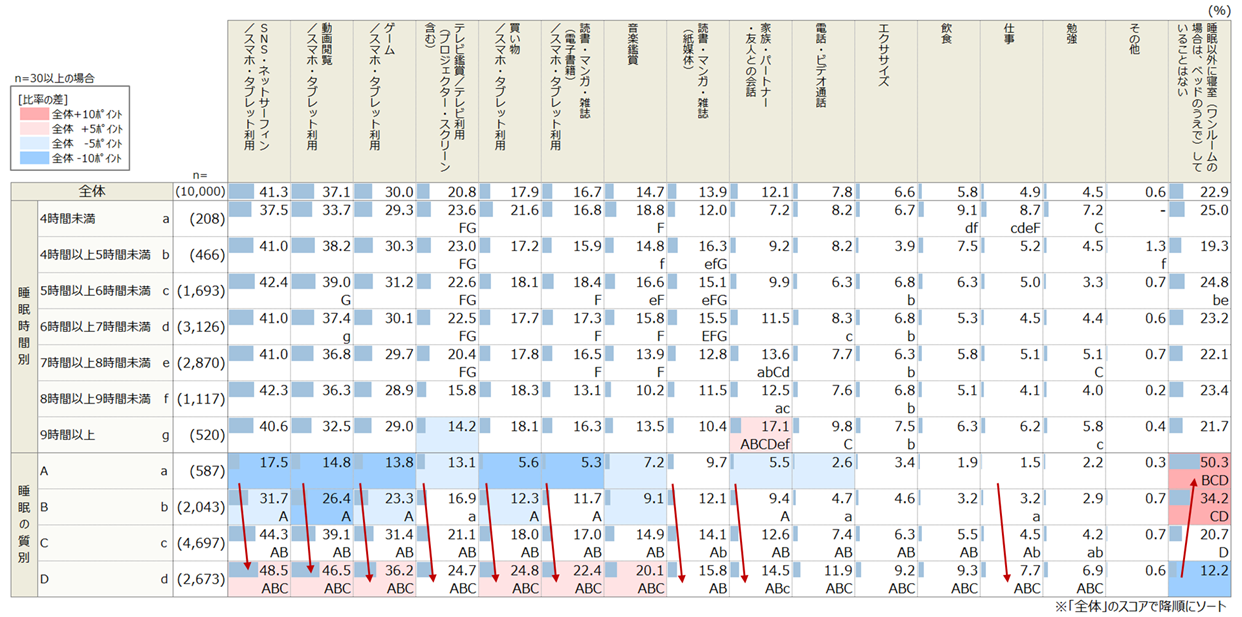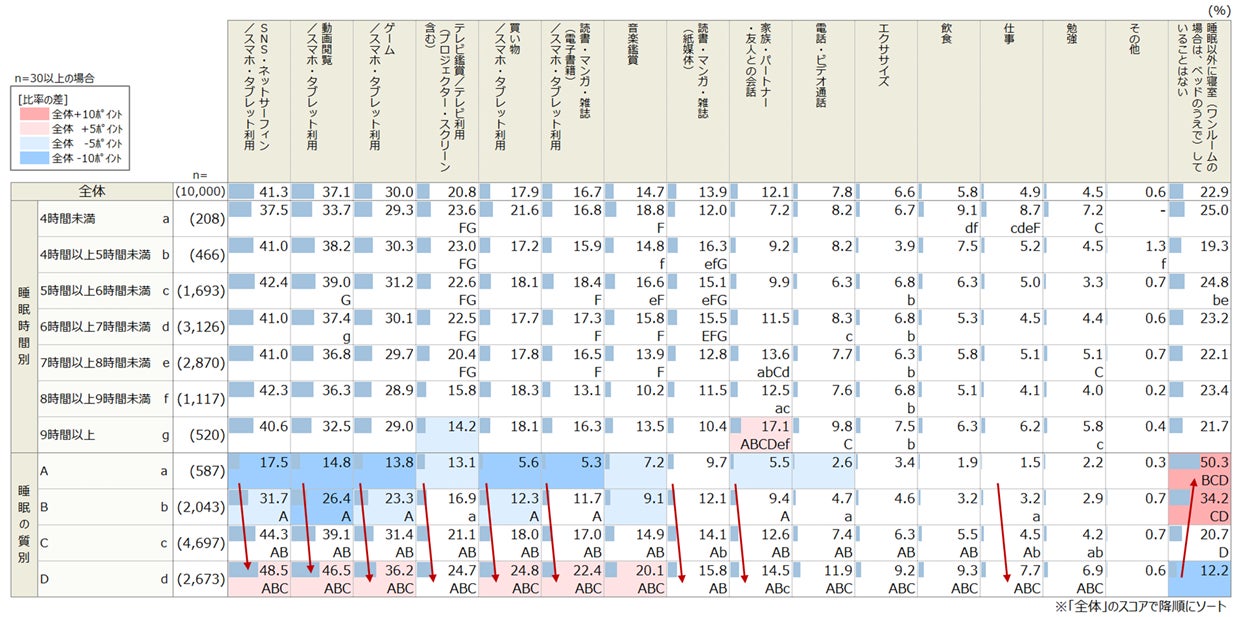 睡眠の質別にみると、質が良い層ほど「睡眠以外に寝室でしていることはない」割合が高く、悪い層ほど様々な作業・娯楽をしている割合が高くなっていました。