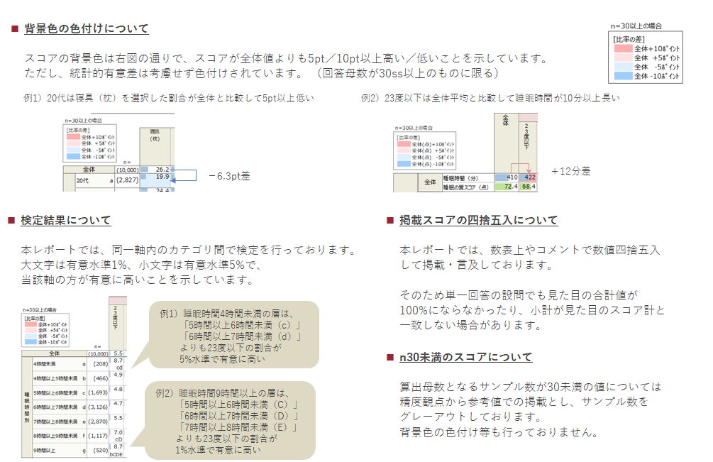 ※集団間の睡眠偏差値、スコアの比較においては、一元分散分析、あるいはt-検定を行い、有意水準5%以下を統計的に有意な差と判定し記載しました。