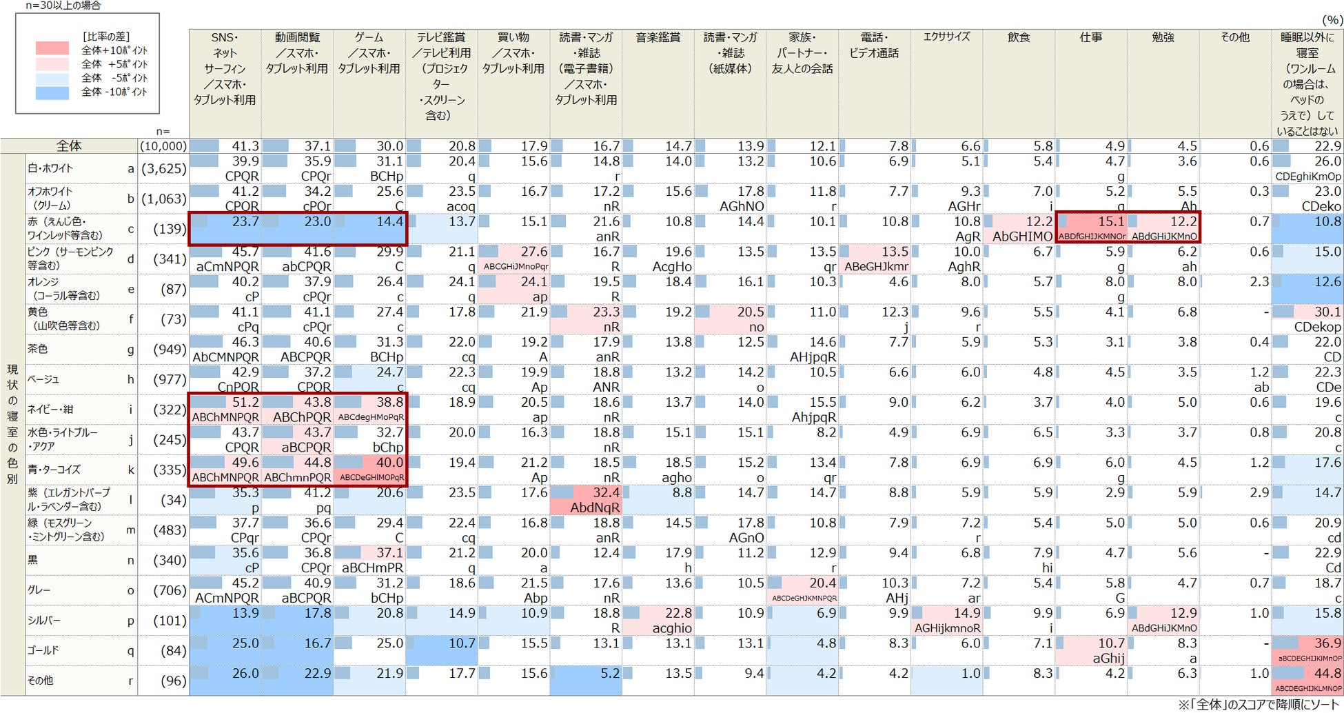 一番、特徴があったのが寝室の色が赤で「仕事」や「勉強」、さらには「飲食」をする割合が他の色よりも高く、全体的で多くの人が行っていたスマホ・タブレットで「SNS・ネットサーフィン」「動画視聴」「ゲーム」などをする割合は低い傾向にありました。