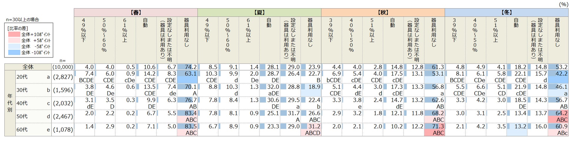 湿度管理器具を利用し湿度設定を行っている方でも、約5割の方が睡眠の観点で推奨される湿度条件(春・夏:50-60%、秋・冬:40-50%)以外または湿度設定は不明と回答するなど、適正湿度を意識的に保とうとする人の割合が少ない傾向にありました。