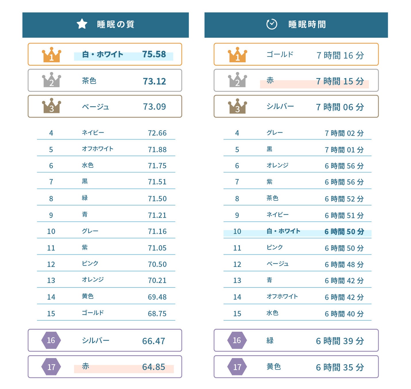 睡眠においては白い寝室で寝ている人がよい睡眠がとれていることがわかりました。睡眠の質のスコアが73.58と最も高く、平均睡眠時間も10,000人の平均である6時間50分確保できていました。続いて茶色、ベージュの順で睡眠の質が高い結果でした。