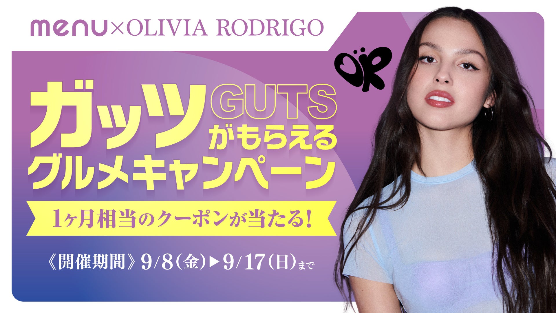 これまでデリバリー&テイクアウトアプリ「menu」は、多くの方にデリバリーを通じた素敵な体験をお届けしてまいりました。今回は世界的な歌手、オリヴィア・ロドリゴのニューアルバム『ガッツ』のリリースを記念して、仕事やプライベートで忙しい日々を送る皆様へ“ガッツ”をお届けしたいといった思いから、ユニバーサル ミュージックと協力し、「ガッツがもらえるグルメキャンペーン」を実施いたします。