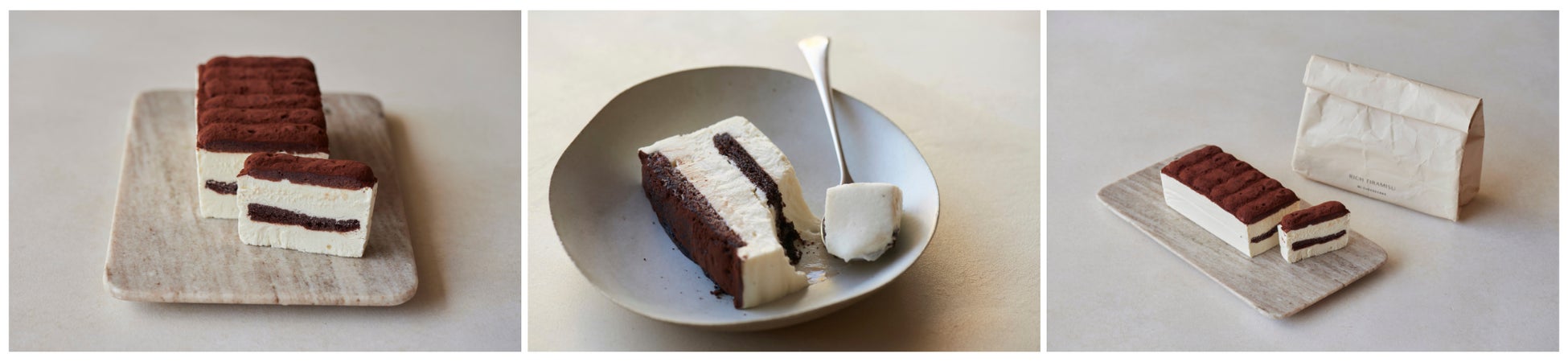コーヒーやカカオ、ほうじ茶が生み出す香ばしい香りと、ムースのように淡い口溶けが特長のティラミス。冷凍のままカットし、温度によって変化する味わいと香りをお楽しみください。オリジナルの保冷バッグに入れてお渡しします。