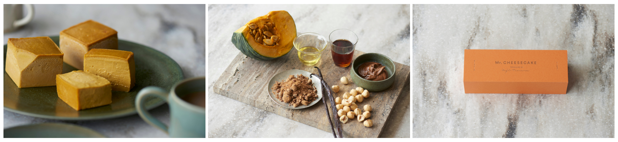 さらに、秋の味覚カボチャを使用したキューブ型ケーキ3種の食べ比べを楽しめるアソートセット「Mr. CHEESECAKE assorted 3-Cube Pumpkin」が登場。ヘーゼルナッツと白トリュフの香りを合わせた味わい深い「Pumpkin Hazelnut White Truffle」、焦がしバターやバニラ、紅茶の香りを合わせた濃厚なコクの「Pumpkin Butterscotch」、シナモンやカルダモン、クローブを合わせたスパイシーな「Chai Tea Pumpkin」を組み合わせた3種のキューブ型ケーキのアソートセットを、オリジナルのボックスに詰めてお渡しします。